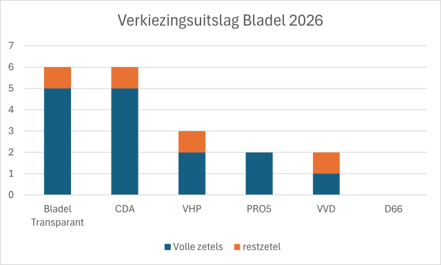 Bladel Transparant (BT) en de Vrije Hapertse Partij (VHP) hebben bij de verkiezingen van 18 maart jongstleden 2 respectievelijk 1 zetel ingeleverd. CDA kreeg er 2 zetels bij, VVD won 1 zetel en PRO5 behield zijn beide zetels. De gemeenteraad van Bladel heeft 19 zetels. Een overzicht van de raadsleden staat op de website: Bladelse gemeenteraadsleden.